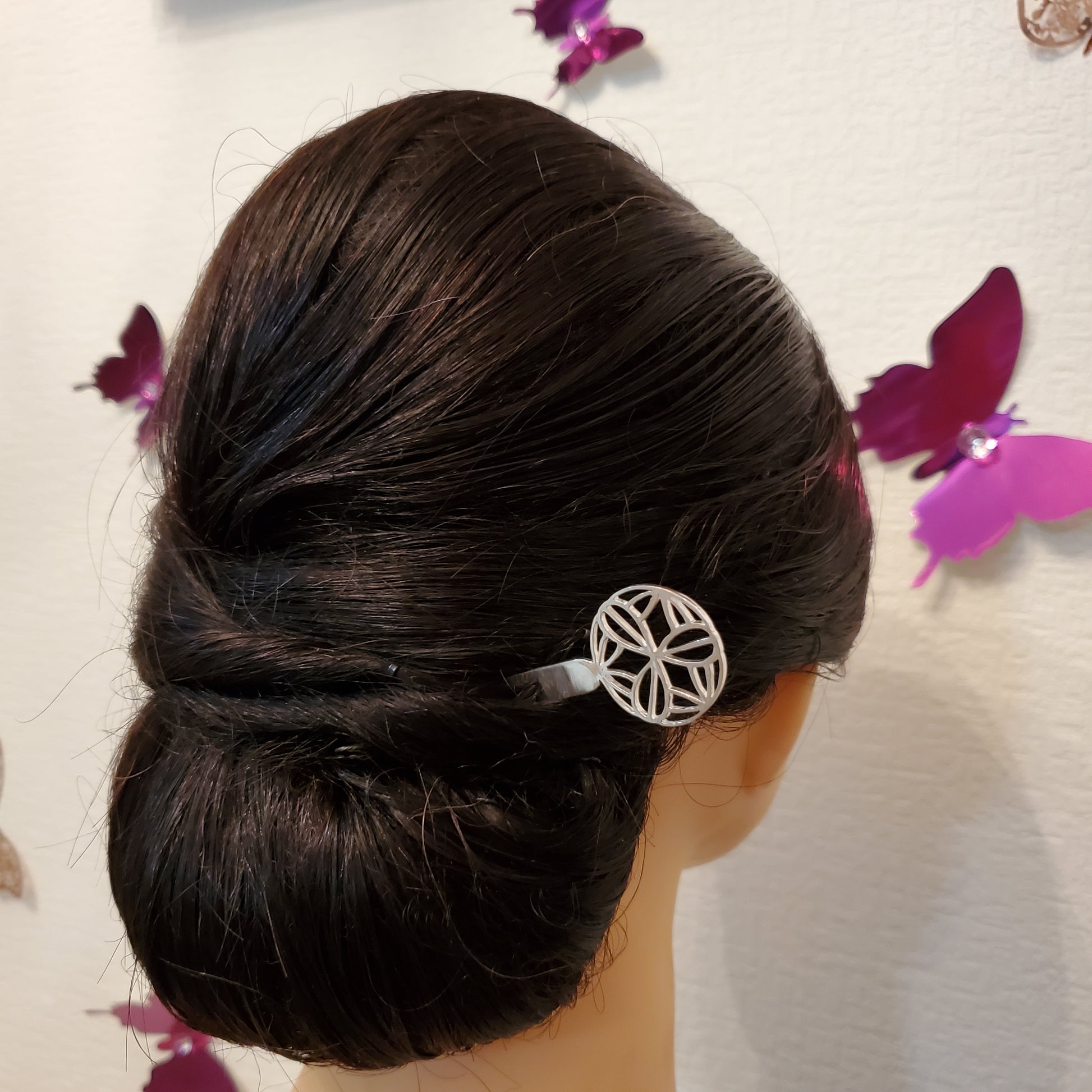 ☆あくまでも髪型が完成した後に、最後の【飾り】として、髪に挿してください。髪色と同じ10㎝~20㎝の糸でかんざしとヘアーピンをつないで、髪から抜け落ちるのを防いでください。