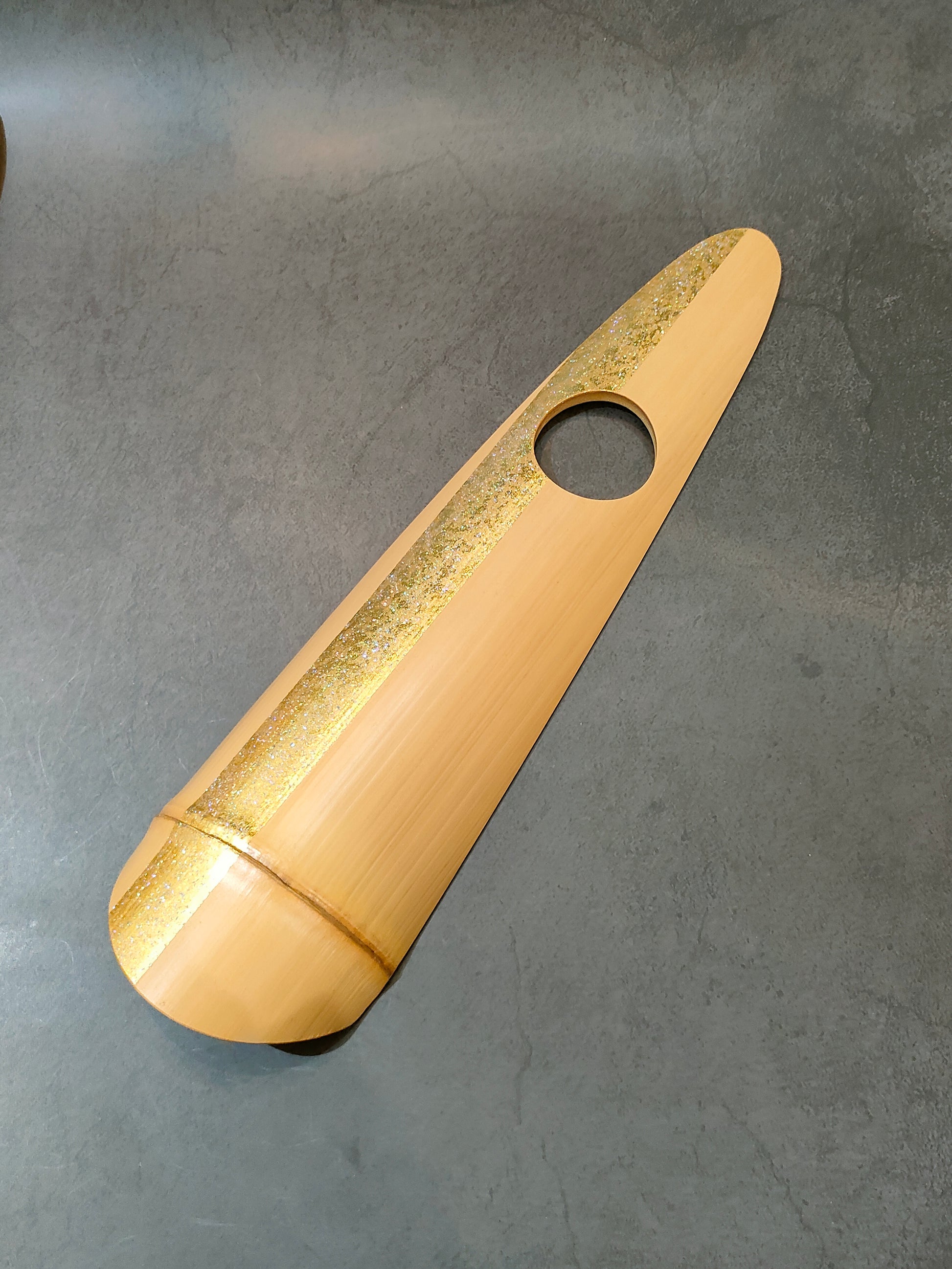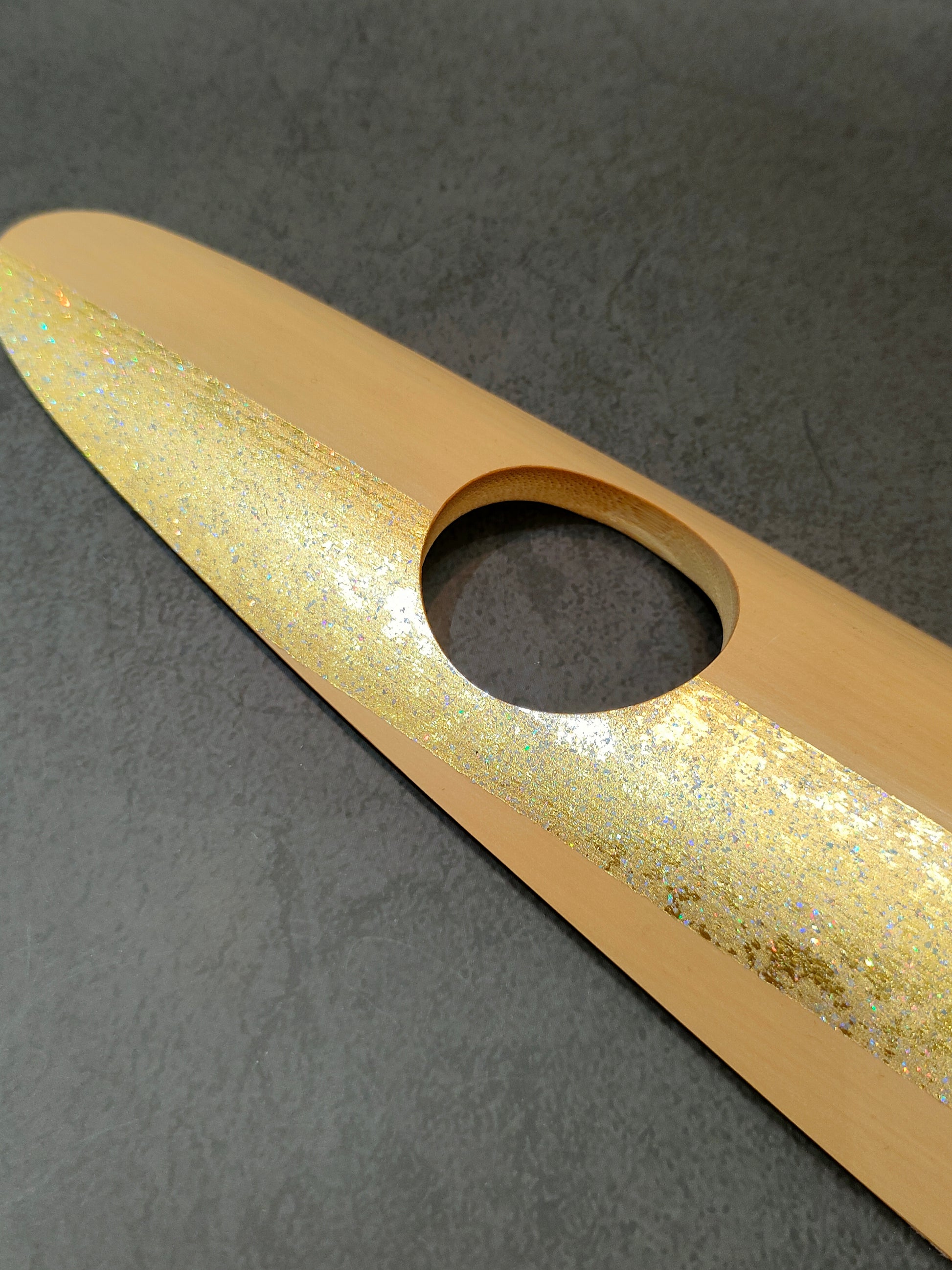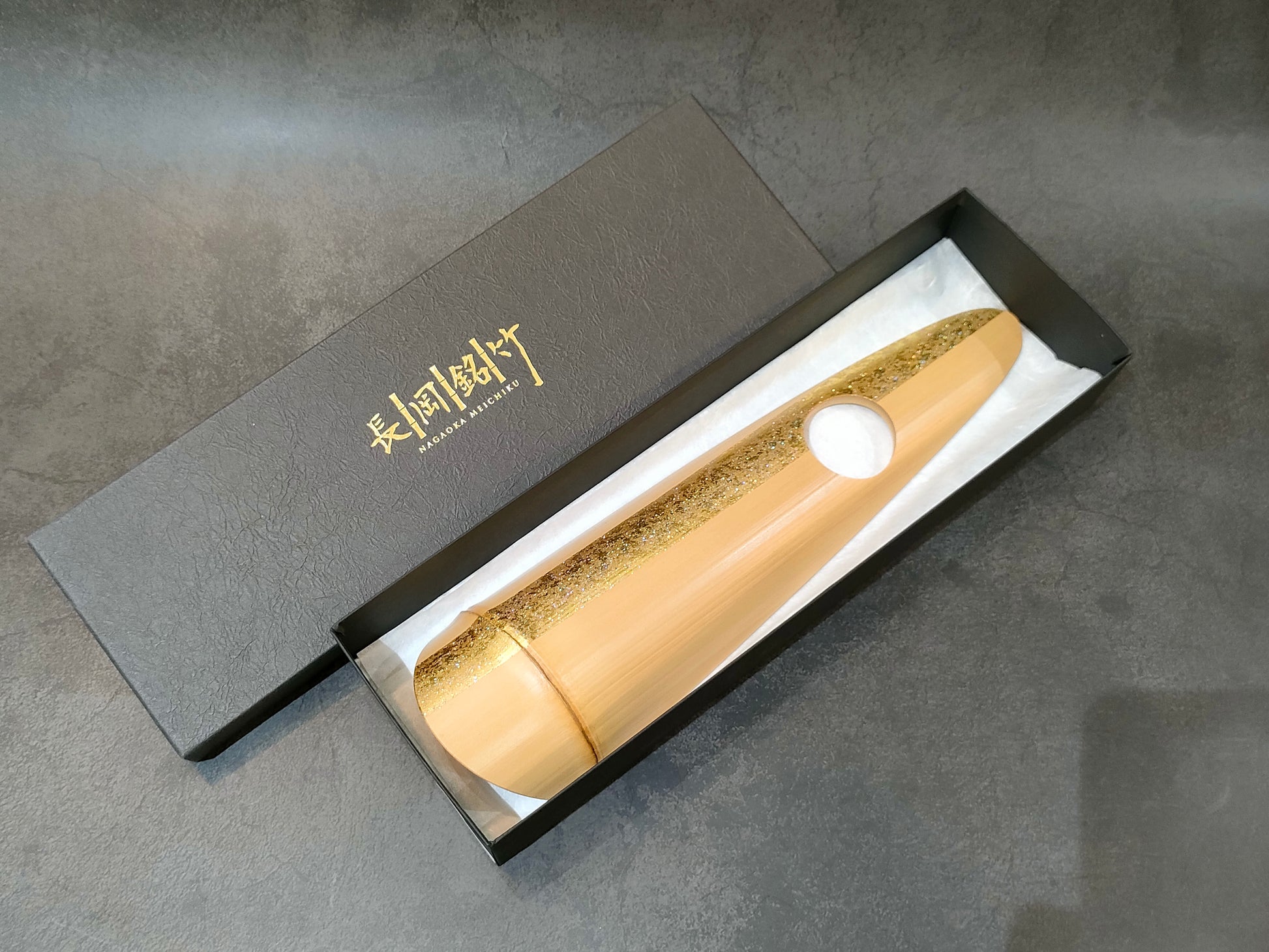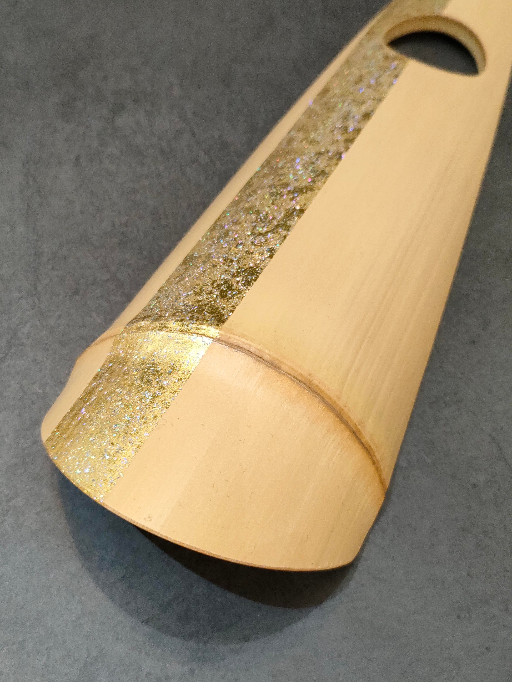 - 京銘竹「白竹」に、京友禅の金彩加工職人が砂子(すなご)という技法で金彩加工を施しています。