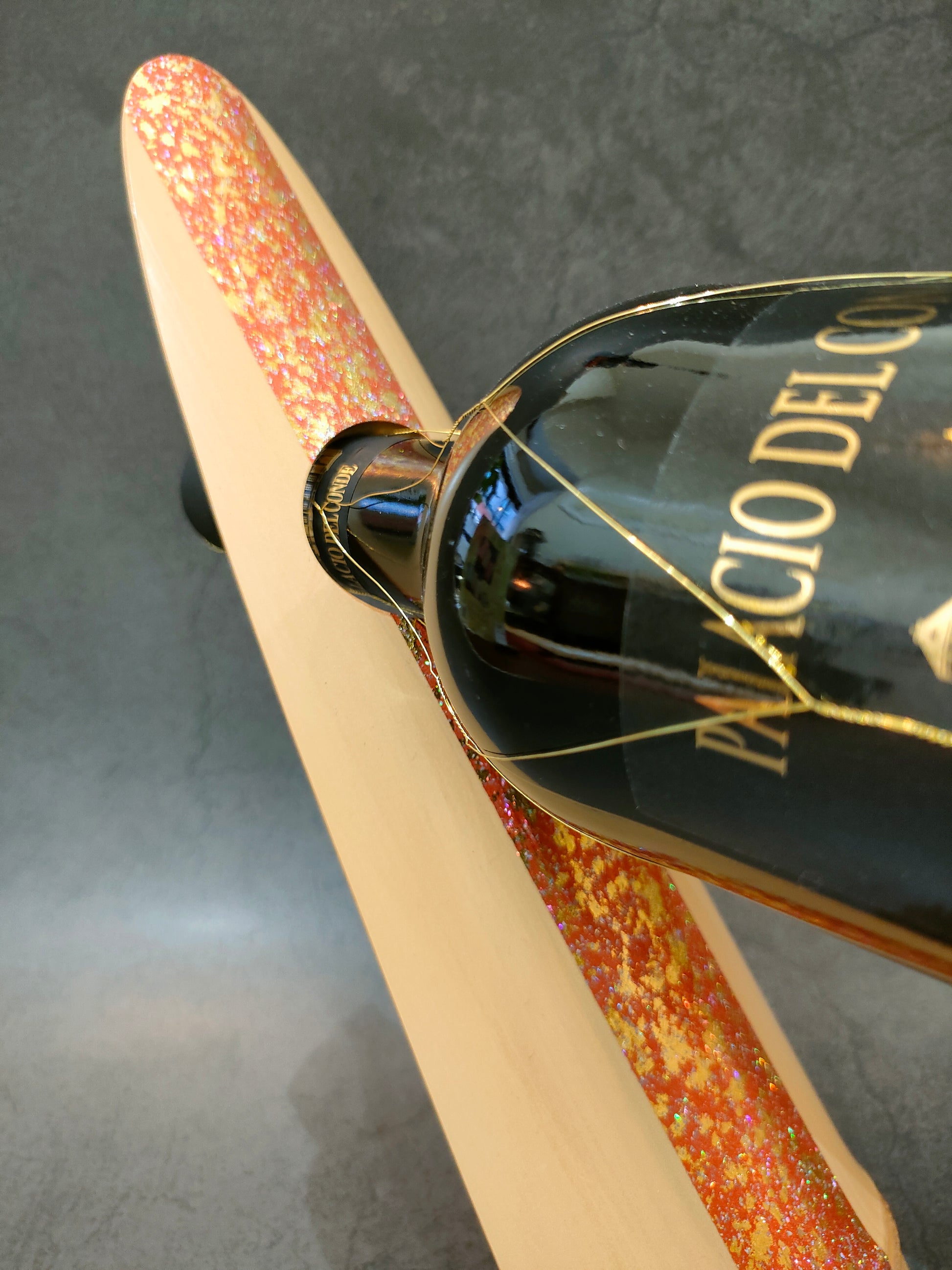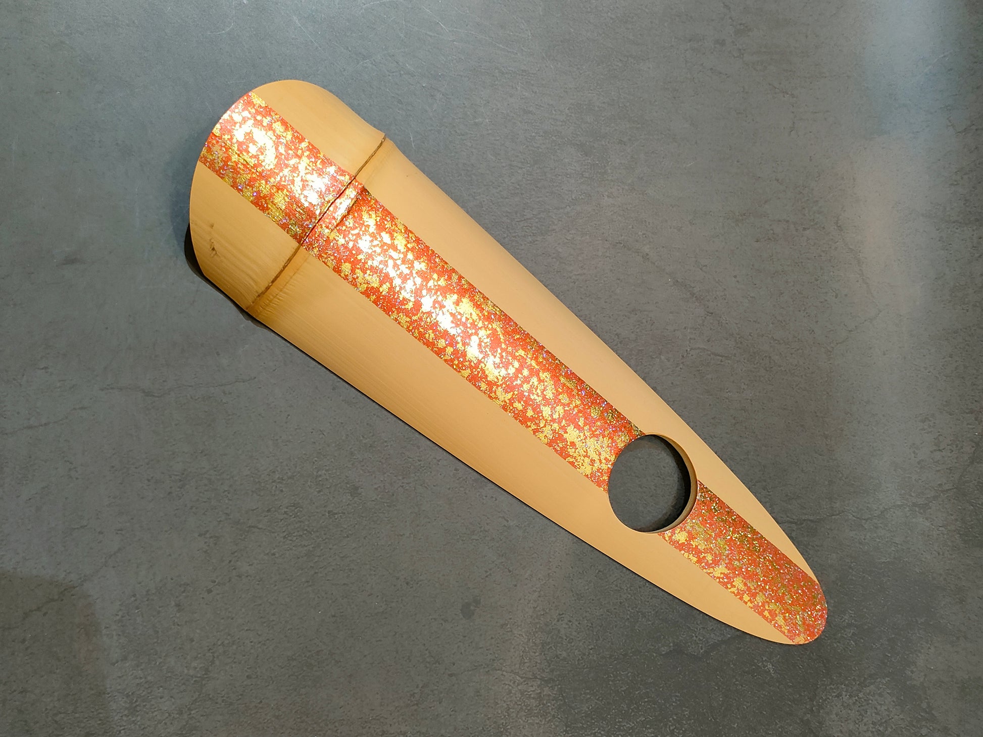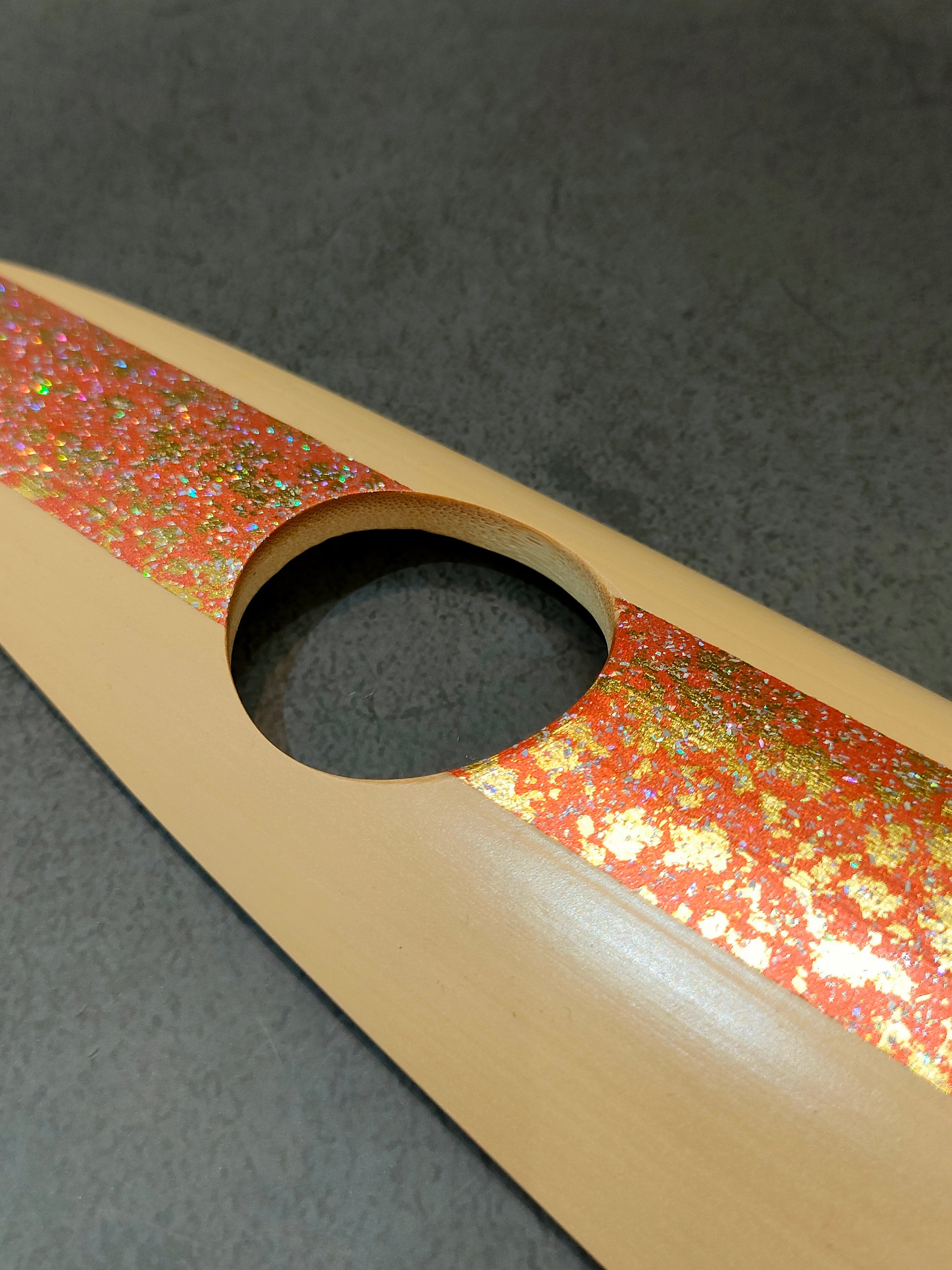 - 京銘竹「白竹」に、京友禅の金彩加工職人が砂子(すなご)という技法で金彩加工を施しています。