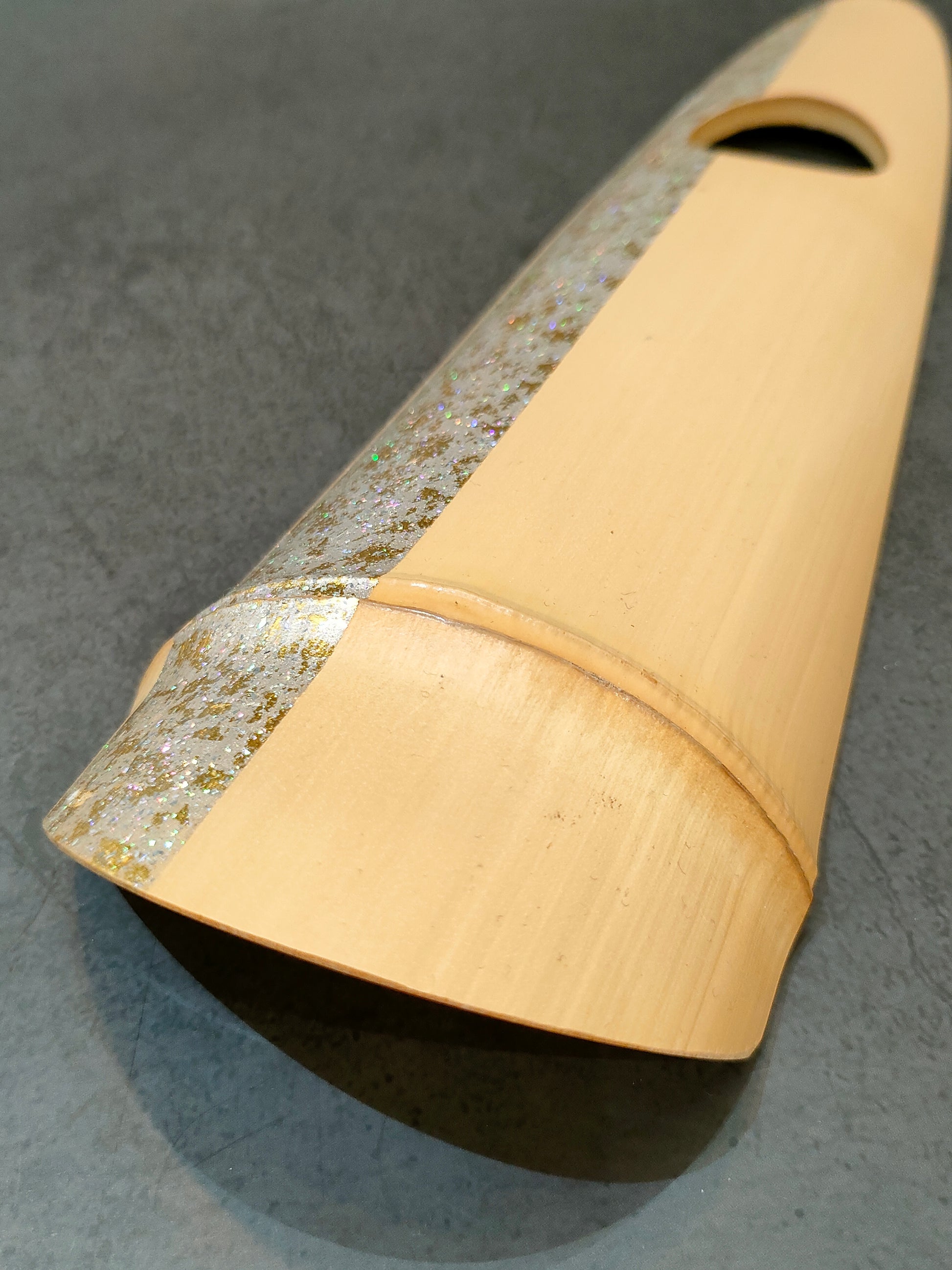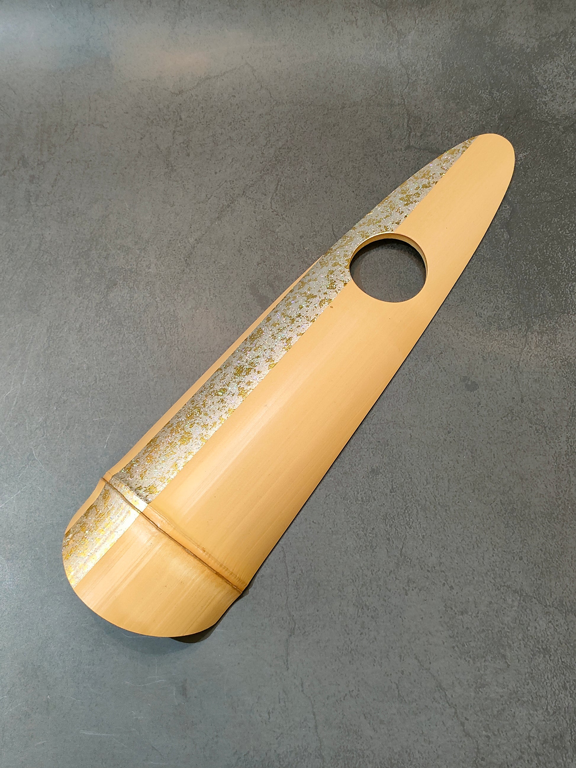 - 京銘竹「白竹」に、京友禅の金彩加工職人が砂子(すなご)という技法で金彩加工を施しています。