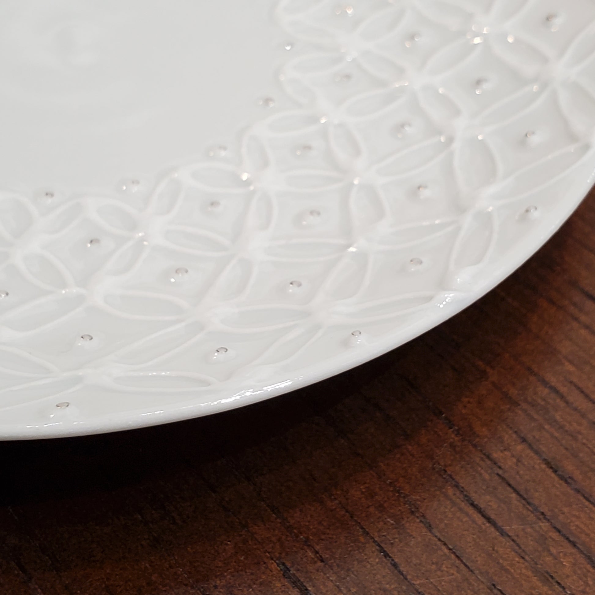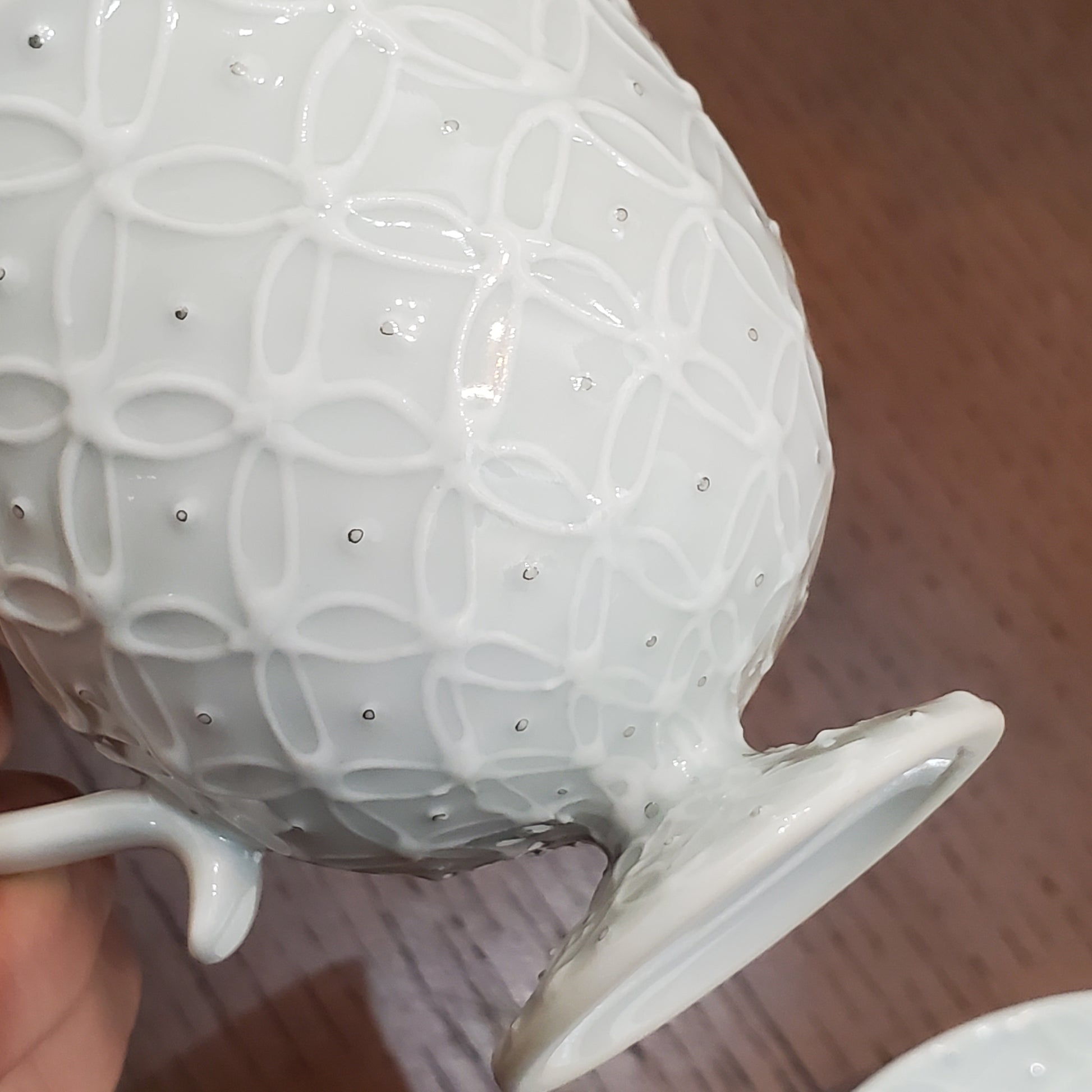 いっちんは粘土をペースト状に水で溶いて袋から絞り出して描画する技法のことで、この商品は白いボディに白のいっちんが施されています。