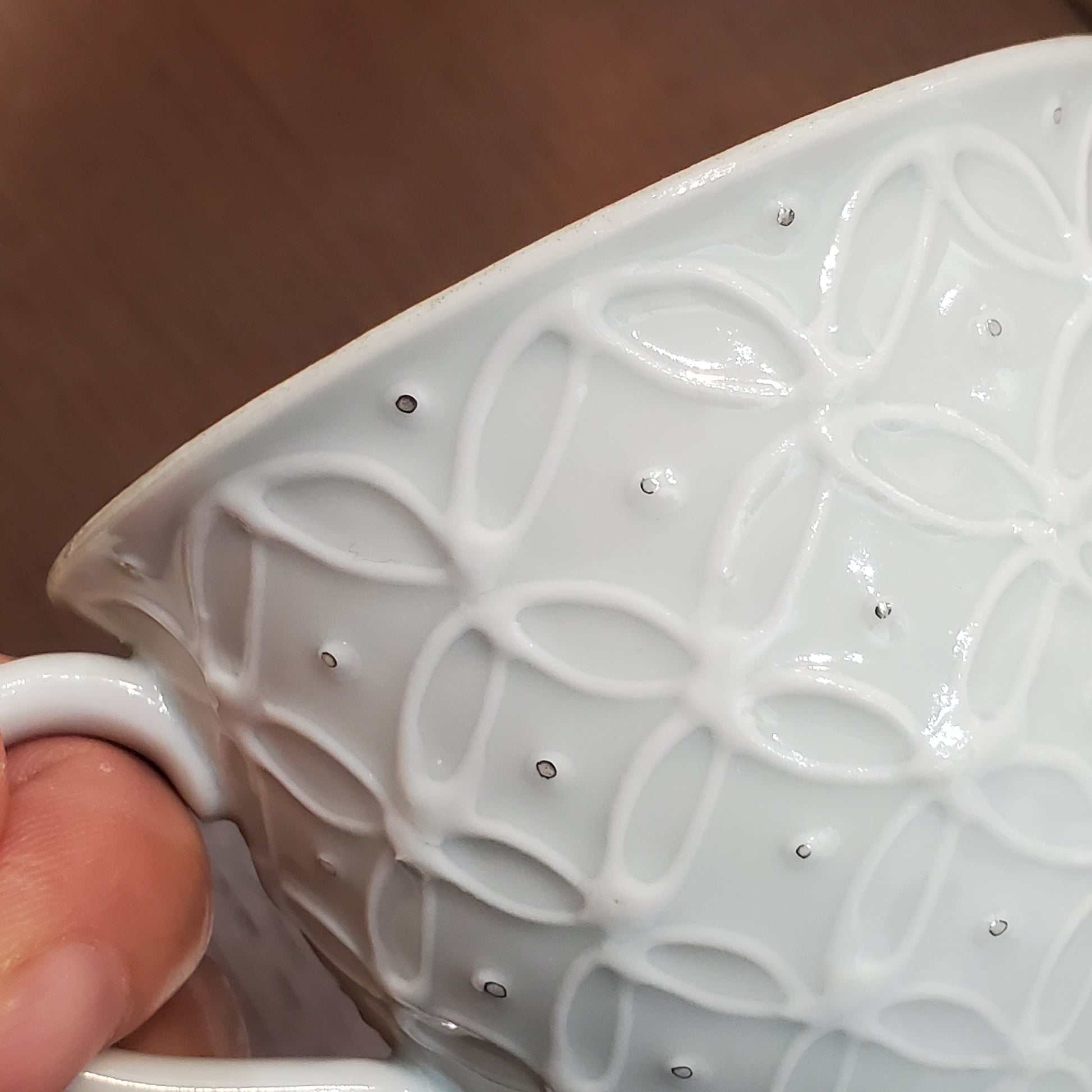 白い磁器のボディにきれいに七宝紋様が入っています。