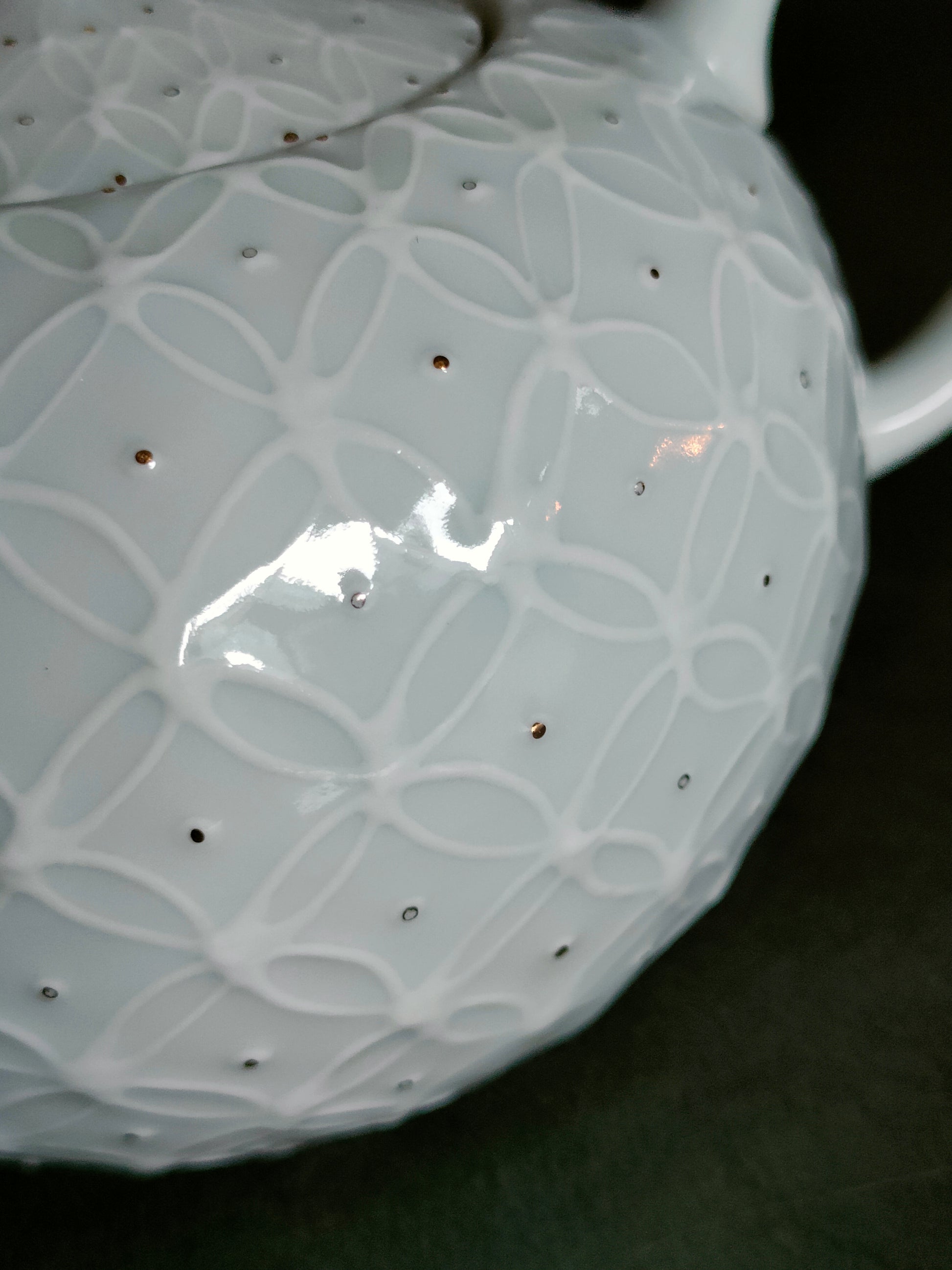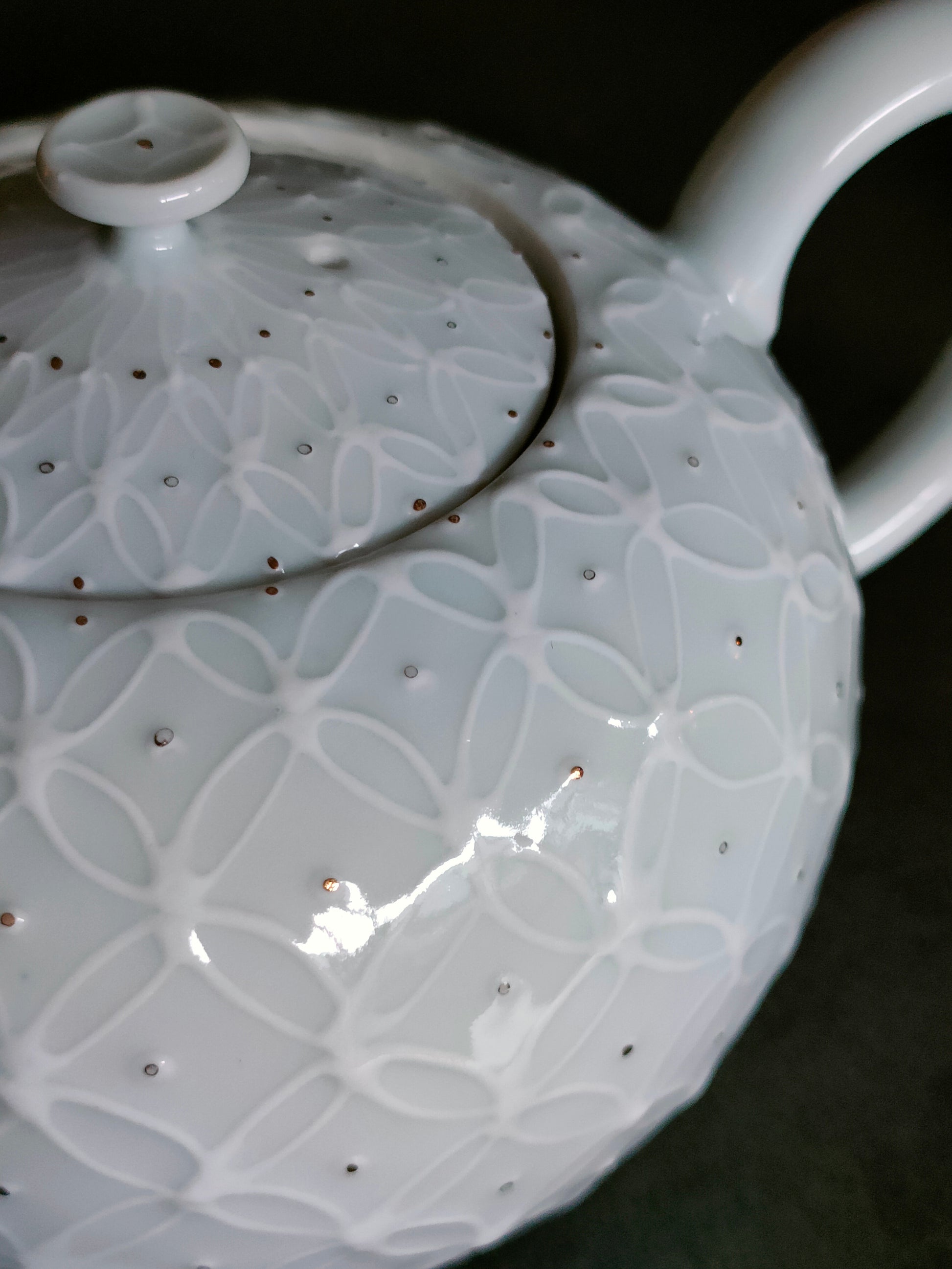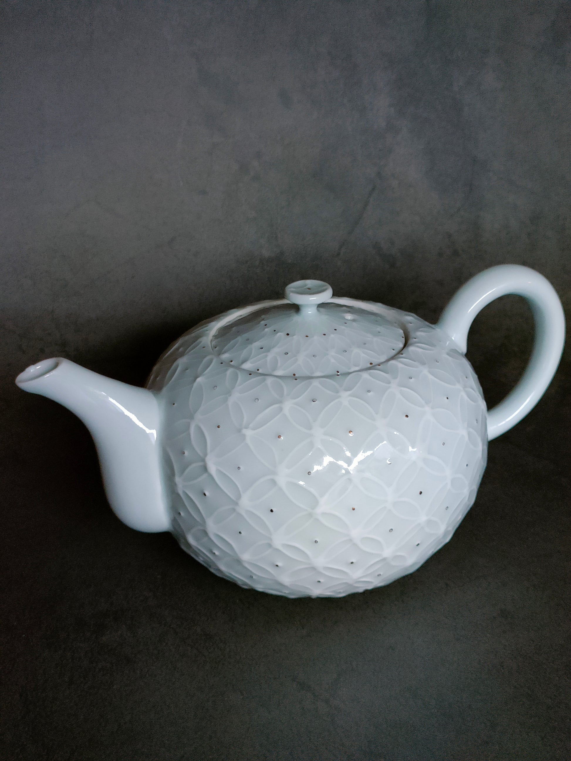 一見真っ白のポットのようでよく見ると文様が入っている、レースのような表現をしています。