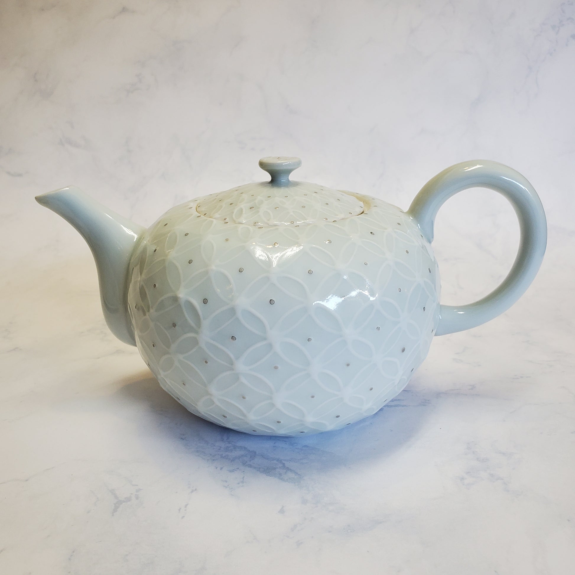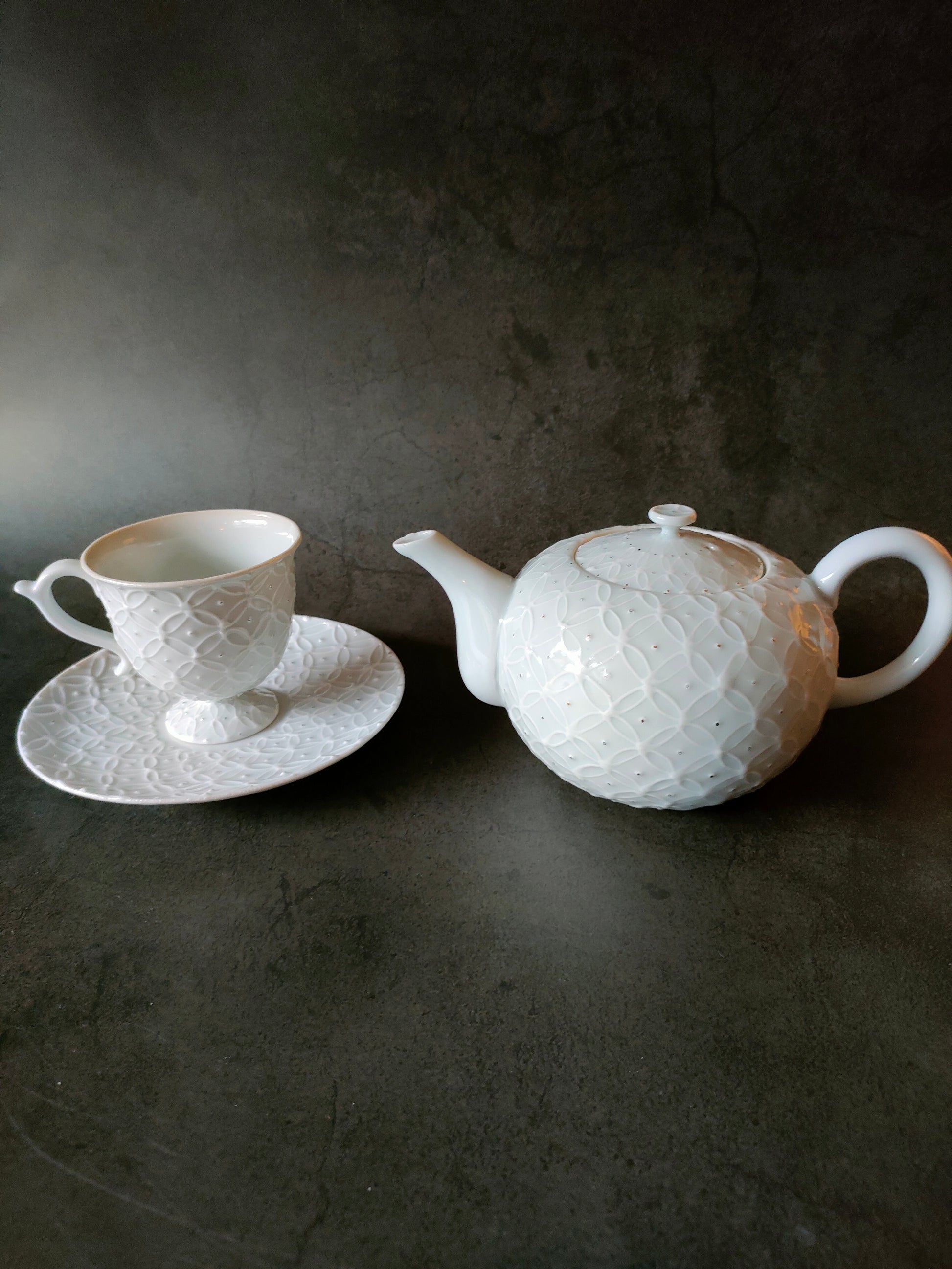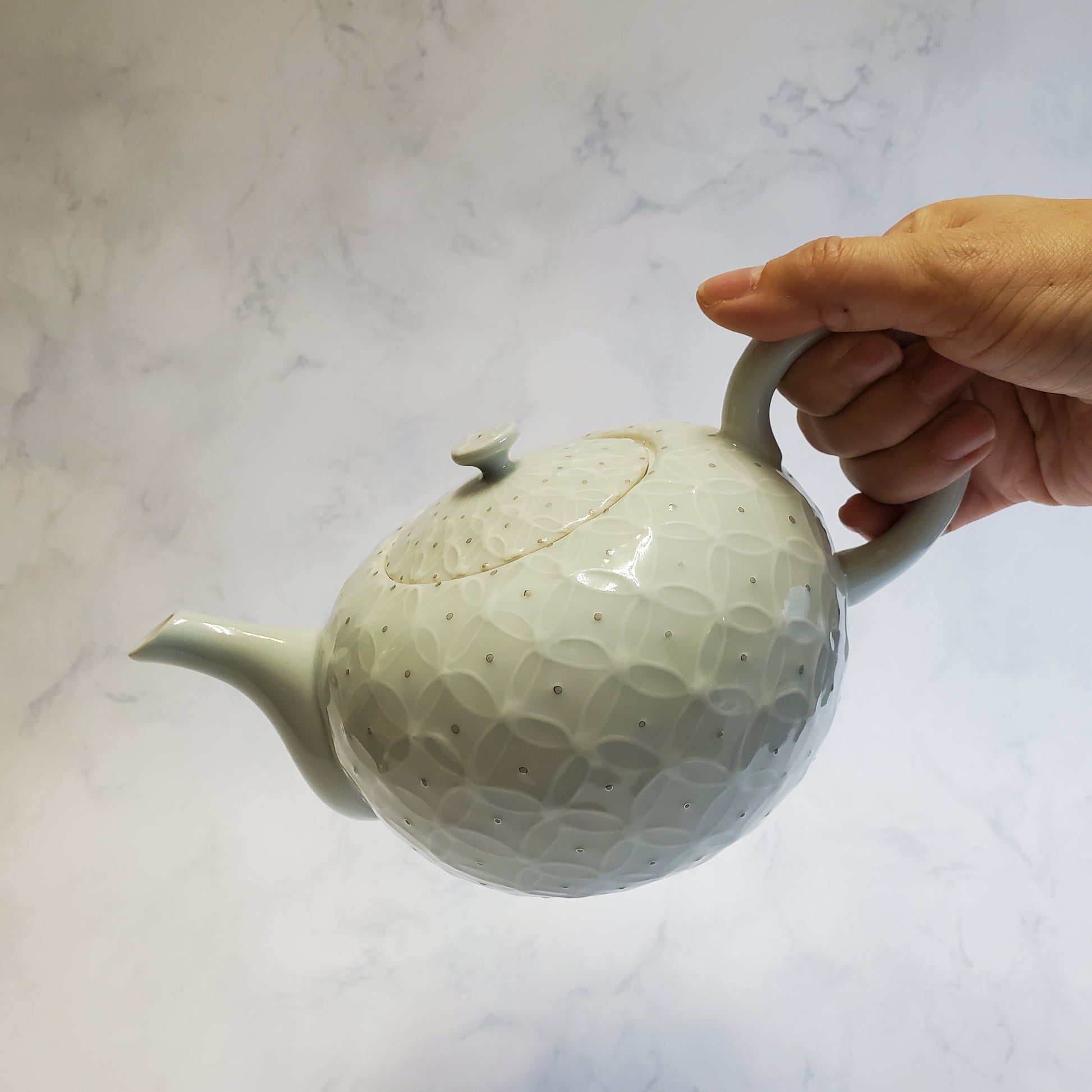 一見真っ白のポットのようでよく見ると文様が入っている、レースのような表現をしています。