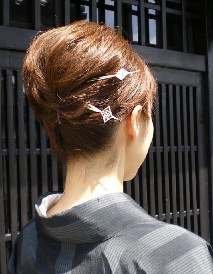 ☆あくまでも髪型が完成した後に、最後の【飾り】として、髪に挿してください。髪色と同じ10㎝~20㎝の糸でかんざしとヘアーピンをつないで、髪から抜け落ちるのを防いでください。