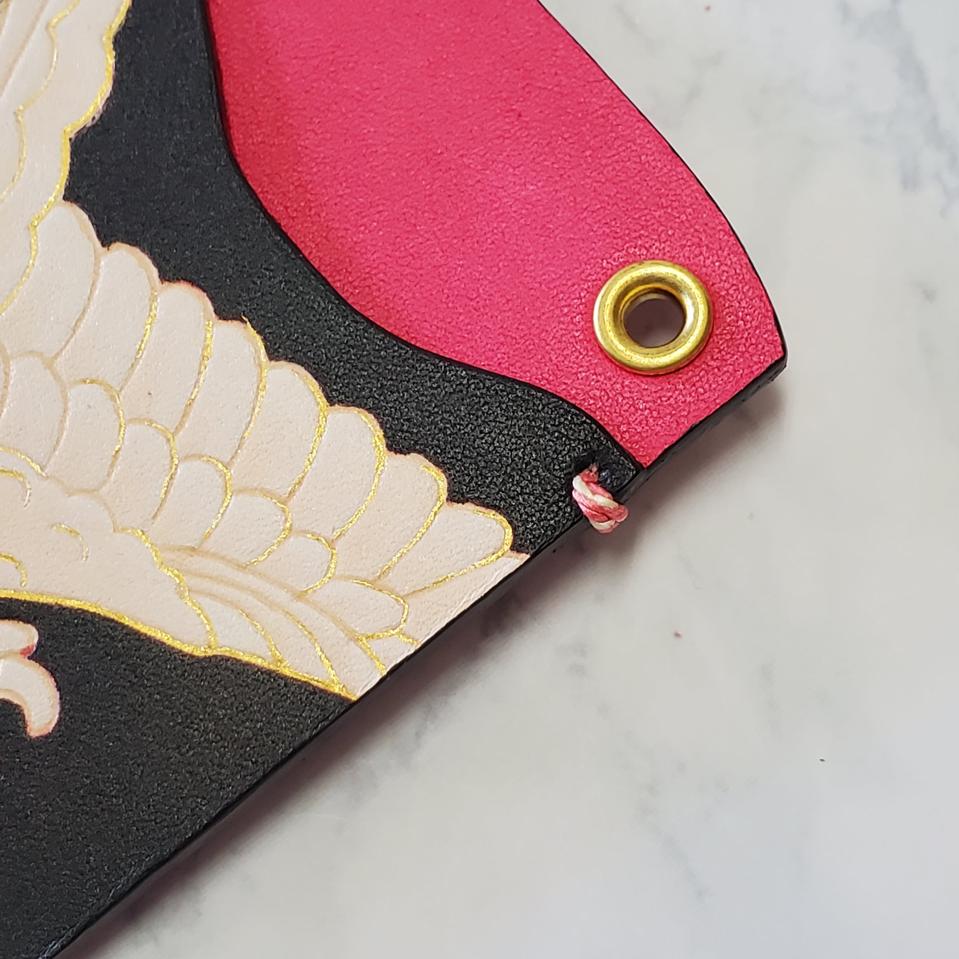 - 和柄小物となると、一般的に着物の端切れを使ったりしますが、布ではなく革なので、破れたり、ほつれる心配がありません。