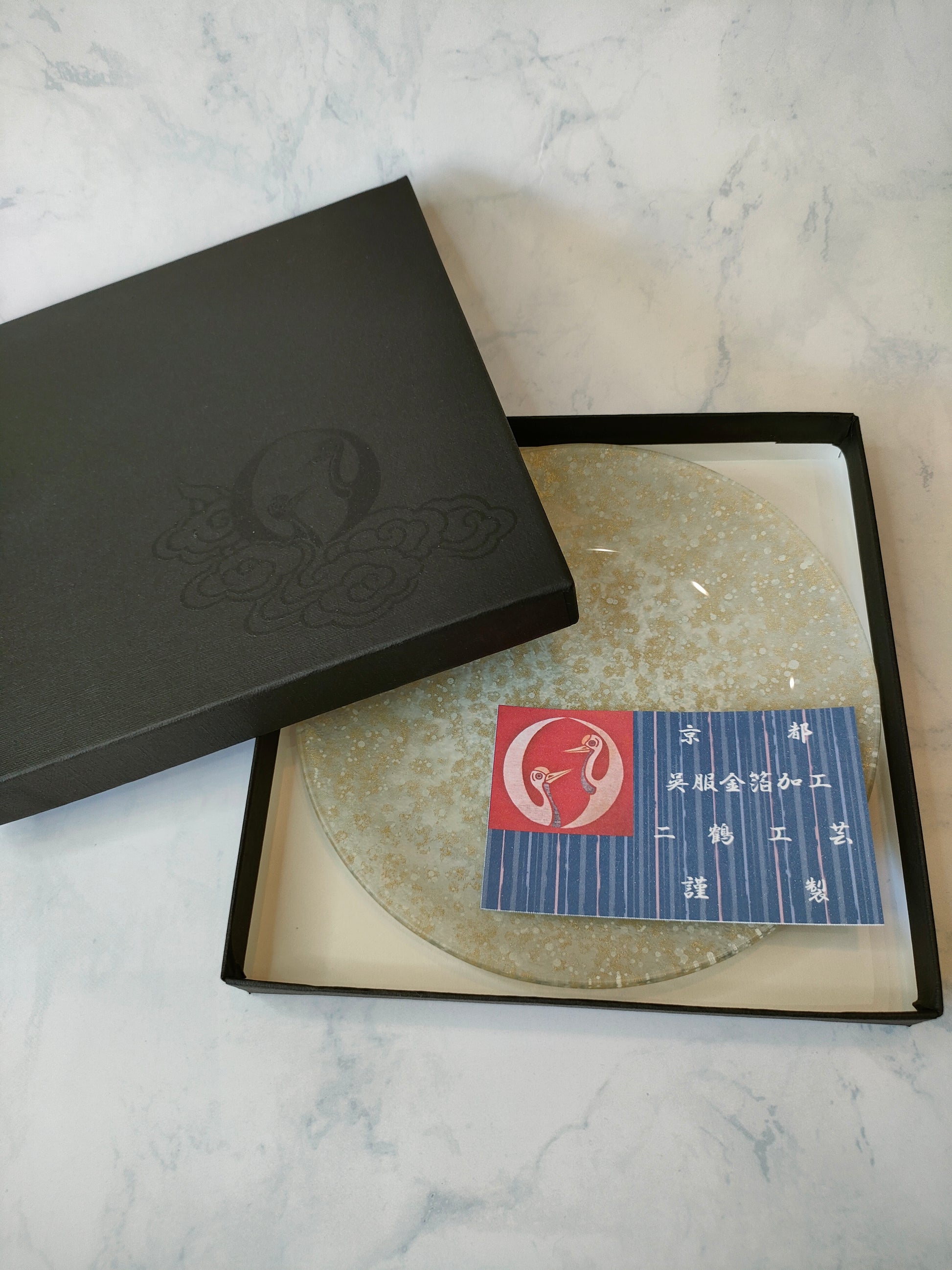 - その生地を特殊加工でガラス皿の裏面に貼り、樹脂とサンドしてあります。