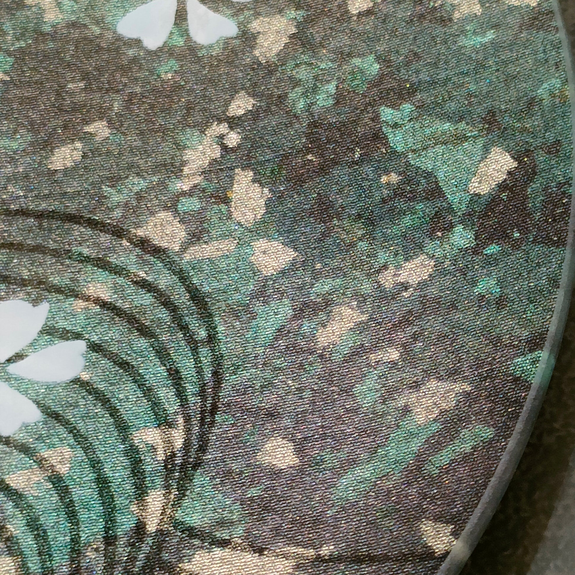 - その生地を特殊加工でガラスに貼りつけ樹脂とサンドしてあります。