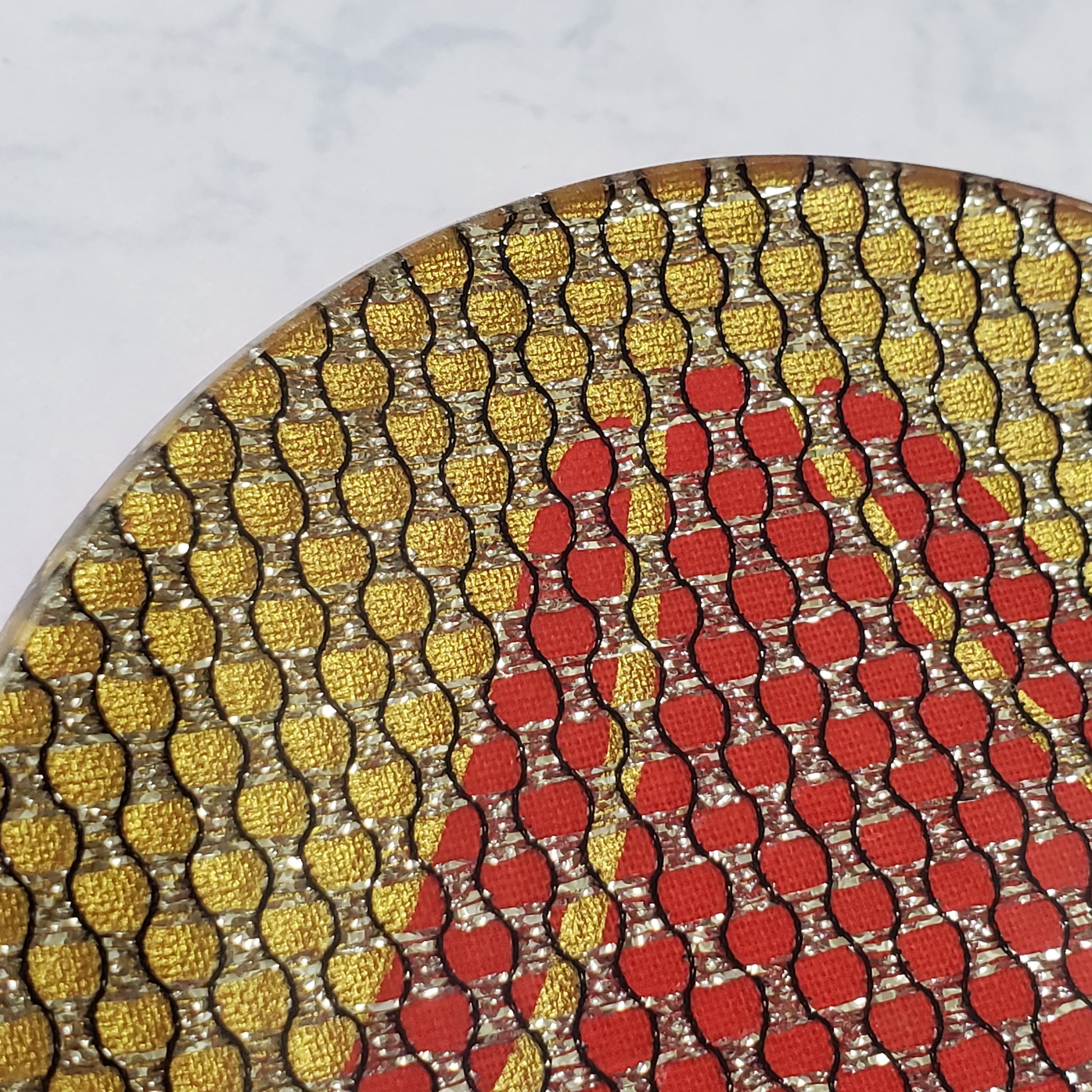 - コットン赤色の生地に純金箔と銀箔で富士山を加工し、異素材の銀ラメ生地との組み合わせです。