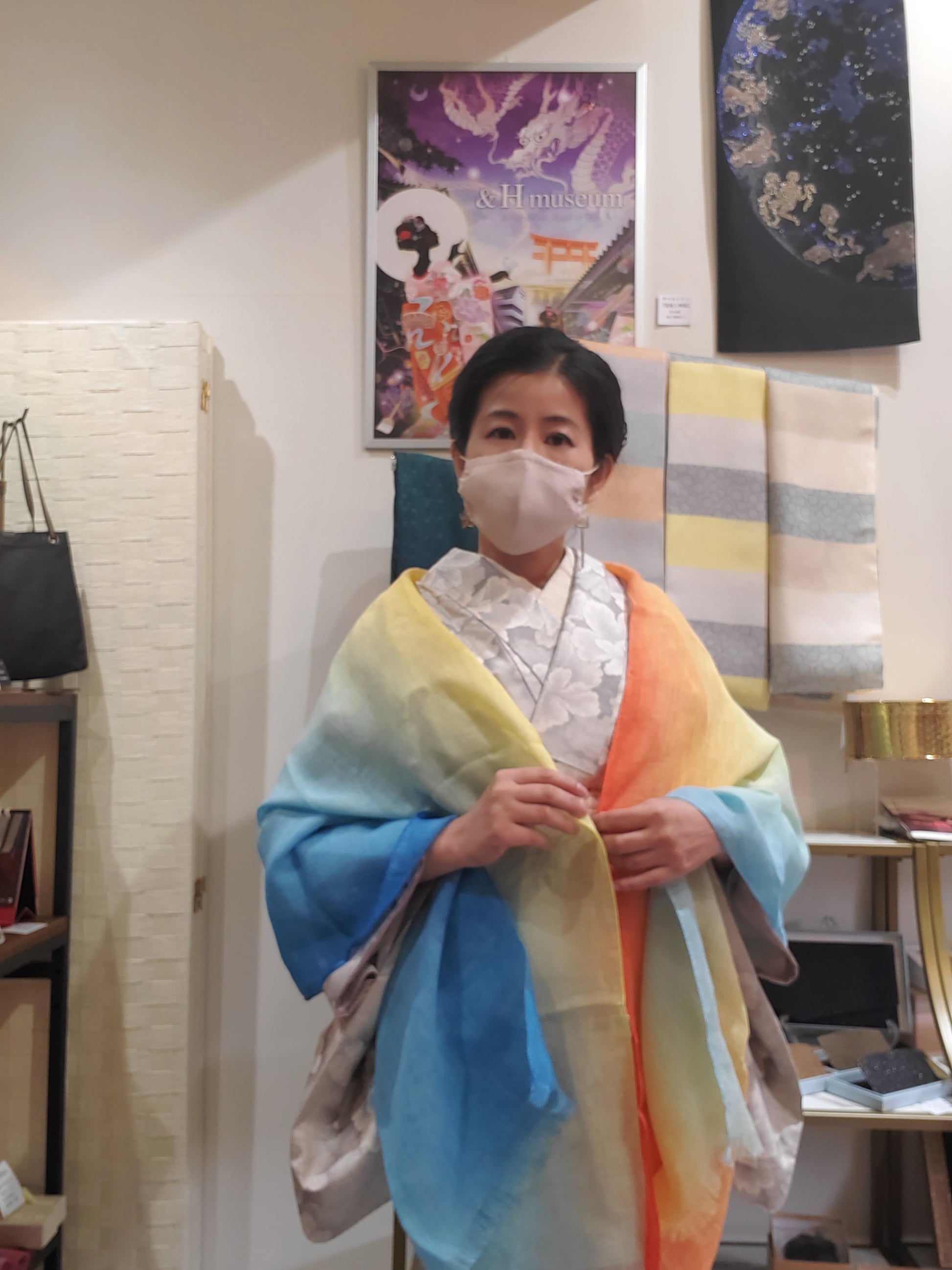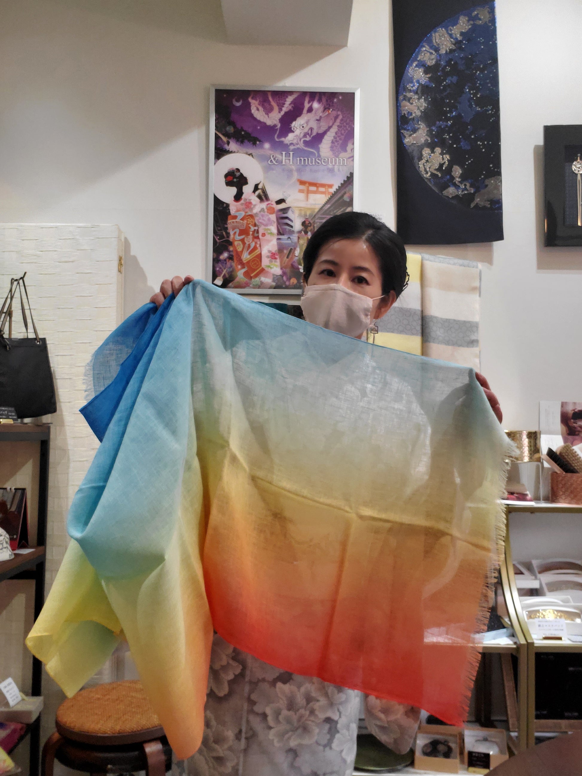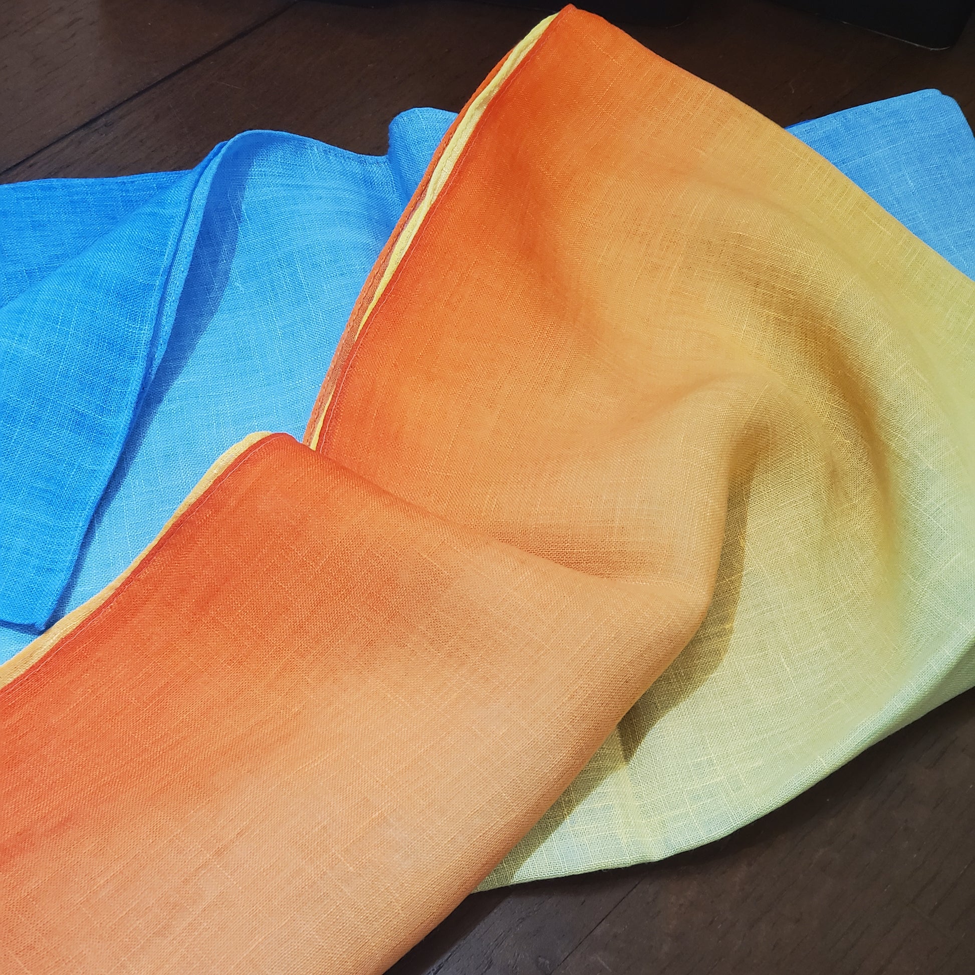リネンの生地に刷毛を使って朝焼け夕焼けの空をイメージした色でグラデーションに染めたストール。
