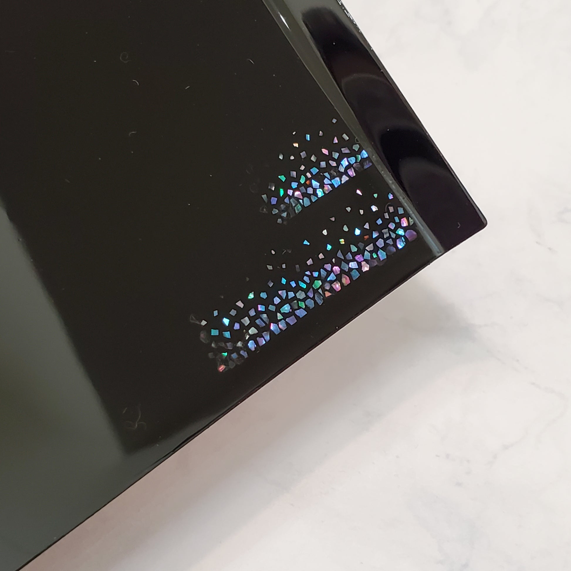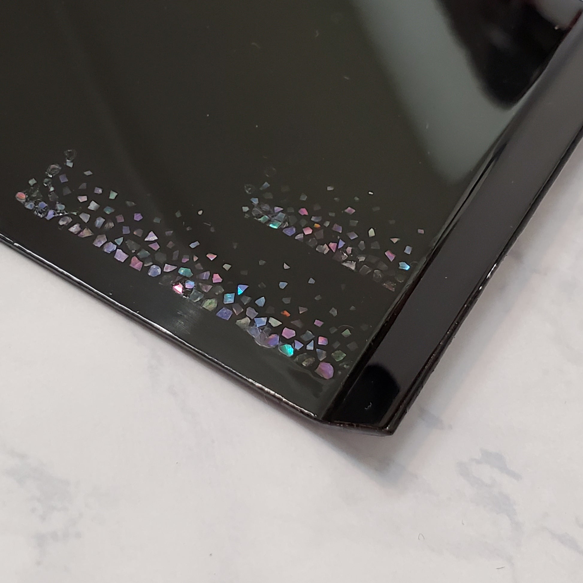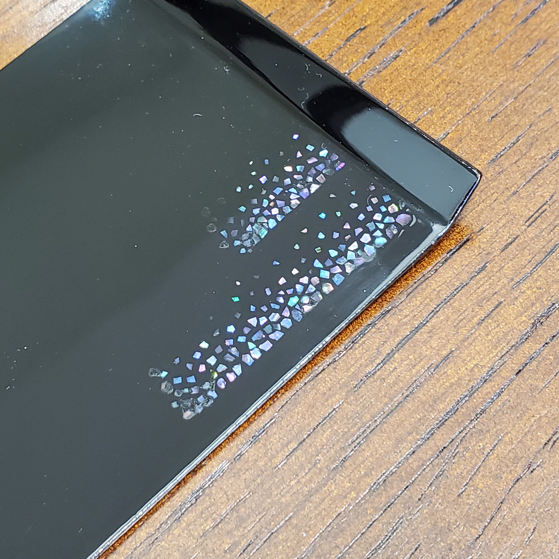 模様部分に重ねて貝を貼り、キラキラと上品に輝きます。